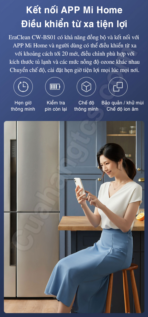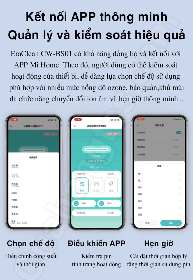 Máy khử trùng CW-BS01 EraClean còn có khả năng đồng bộ và kết nối với App Mihome. Theo đó, người dùng có thể kiểm soát hoạt động của thiết bị từ xa trong phạm vi 20m. Dễ dàng lựa chọn chế độ sử dụng phù hợp với dung tích tủ lạnh cũng như mức nồng độ ozone khác nhau. Đồng thời, bạn cũng có thể thiết lập sẵn thời gian cụ thể để máy hoạt động một cách thông minh.
