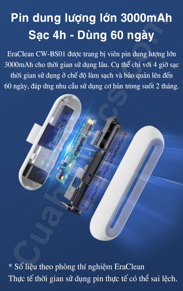 Máy khử mùi tủ lạnh CW-BS01 được trang bị viên pin dung lượng lớn 3000mAh, cho tuổi thọ lâu dài. Cụ thể chỉ với 4 giờ sạc, sản phẩm cho thời gian sử dụng ở chế độ làm sạch và bảo quản lên đến 60 ngày, đáp ứng nhu cầu sử dụng cơ bản trong suốt 2 tháng.