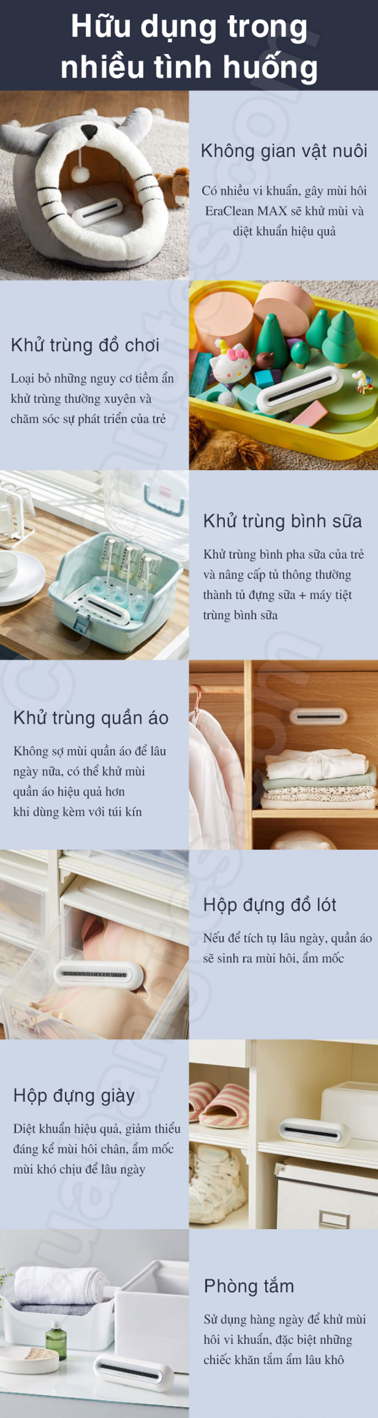 Sản phẩm cũng giúp loại bỏ đến 95% amoniac trong 24 giờ, hỗ trợ nâng cấp tính năng khử trùng sâu, phân hủy mùi đặc biệt, giảm thiểu mùi hôi khó chịu. Bên cạnh ưu điểm tiệt trùng và khử mùi, Máy khử mùi EraClean CW-BS01 còn có thể ức chế các chất làm chín như Ethylene trên bề mặt rau củ để kéo dài độ tươi của thực phẩm.