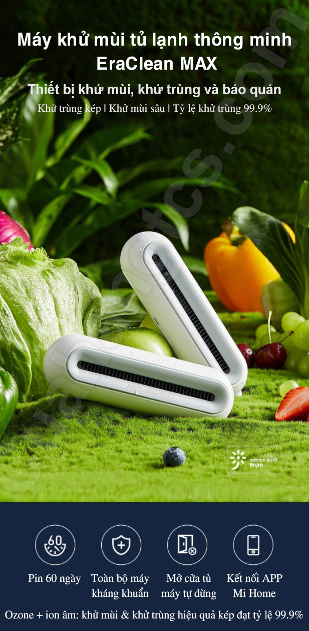 EraClean CW-BS01 là máy tiệt trùng khử mùi tủ lạnh thông minh, với khả năng khử khuẩn hiệu quả đến 99.9%, giúp khử mùi và kéo dài độ tươi mới của thực phẩm, hỗ trợ kết nối App Mihome, được trang bị dung lượng pin lớn, cho thời gian sử dụng lên đến 60 ngày.