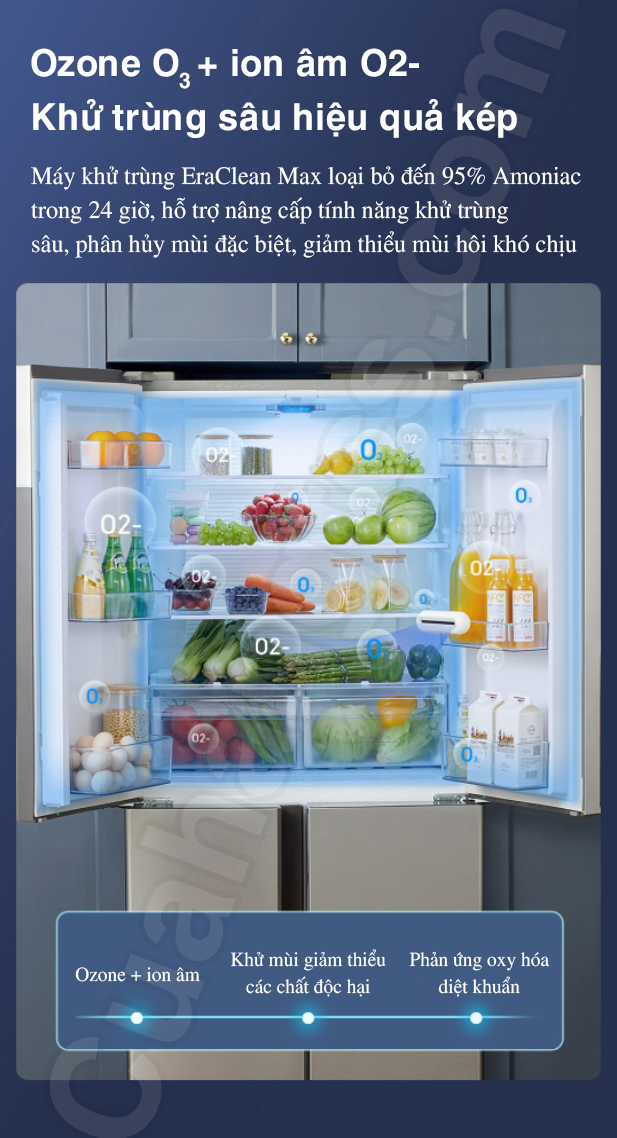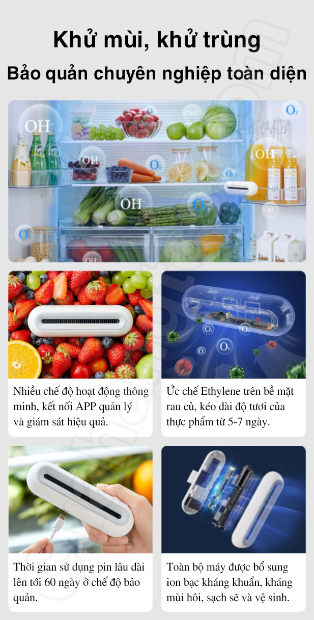 Cụ thể, máy hoat động trên cơ chế khử trùng tuần hoàn, kết hợp với thiết kế móc treo, không chiếm diện tích, giúp khí ozone phân bố đều trên từng tầng, tác động lên mọi ngóc ngách của tủ lạnh, giải phóng ozone một cách khoa học, chủ động tiêu diệt các phân tử vi khuẩn với tỷ lệ khử trùng hiệu quả tới 99.9%. Được biết, quá trình khử trùng với ozone có tính oxy hóa mạnh, có thể phá hủy DNA và RNA của vi khuẩn, hỗ trợ tiêu diệt vi sinh vật trong nước với hiệu suất gấp 600 – 3000 lần Clo.