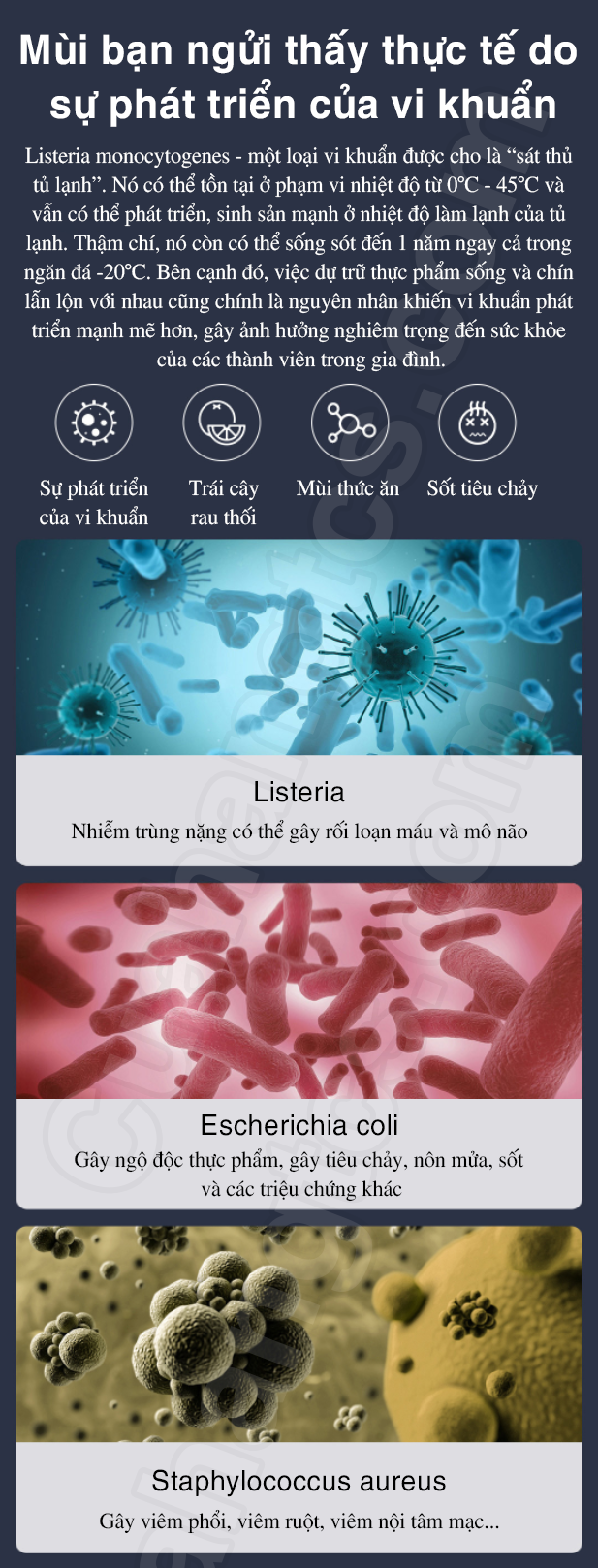 Listeria monocytogenes – một loại vi khuẩn được cho là “sát thủ tủ lạnh”. Nó có thể tồn tại ở phạm vi nhiệt độ từ 0°C – 45°C và vẫn có thể phát triển, sinh sản mạnh ở nhiệt độ làm lạnh của tủ lạnh. Thậm chí, nó còn có thể sống sót đến 1 năm ngay cả trong ngăn đá -20°C. Bên cạnh đó, việc dự trữ thực phẩm sống và chín lẫn lộn với nhau cũng chính là nguyên nhân khiến vi khuẩn phát triển mạnh mẽ hơn, gây ảnh hưởng nghiêm trọng đến sức khỏe của các thành viên trong gia đình.