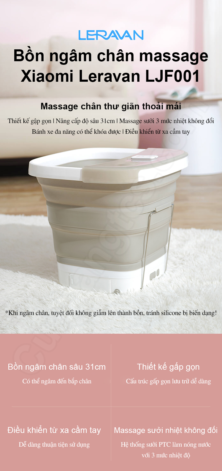 Bồn ngâm chân massage Leravan LJF001 Xiaomi với thiết kế gấp gọn, 3 mức nhiệt không đổi, bánh xe đa năng, điều khiển từ xa dễ dùng, bồn ngâm nâng cấp cao 31cm, chế độ sủi bọt bong bóng thông minh.