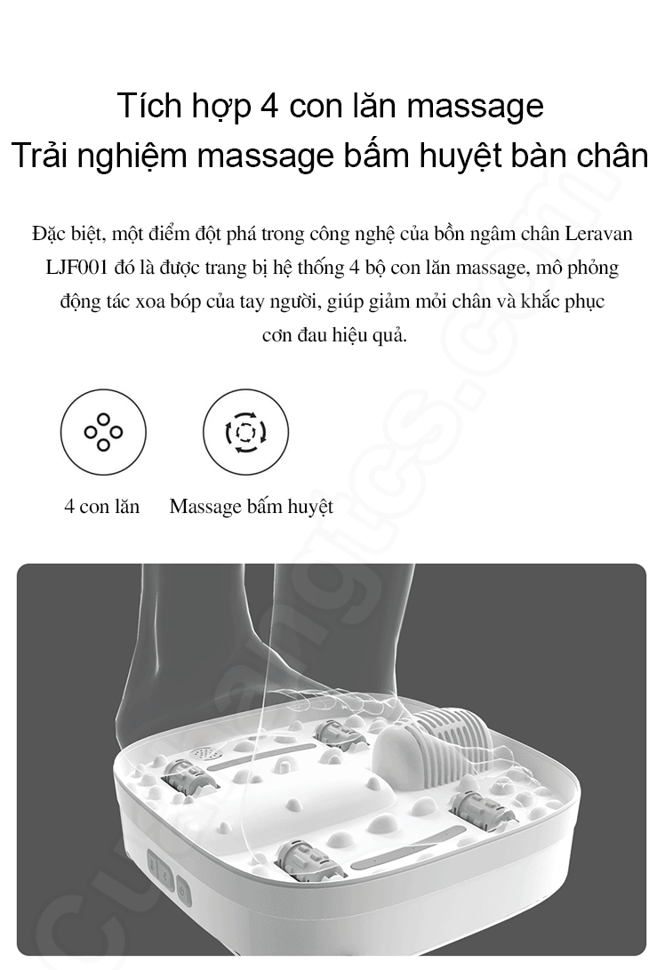 Một điểm đột phá trong công nghệ của Chậu ngâm chân massage Xiaomi LJF001 đó là được trang bị hệ thống 4 bộ con lăn massage, mô phỏng động tác xoa bóp của tay người, giúp giảm mỏi chân và khắc phục cơn đau hiệu quả.
