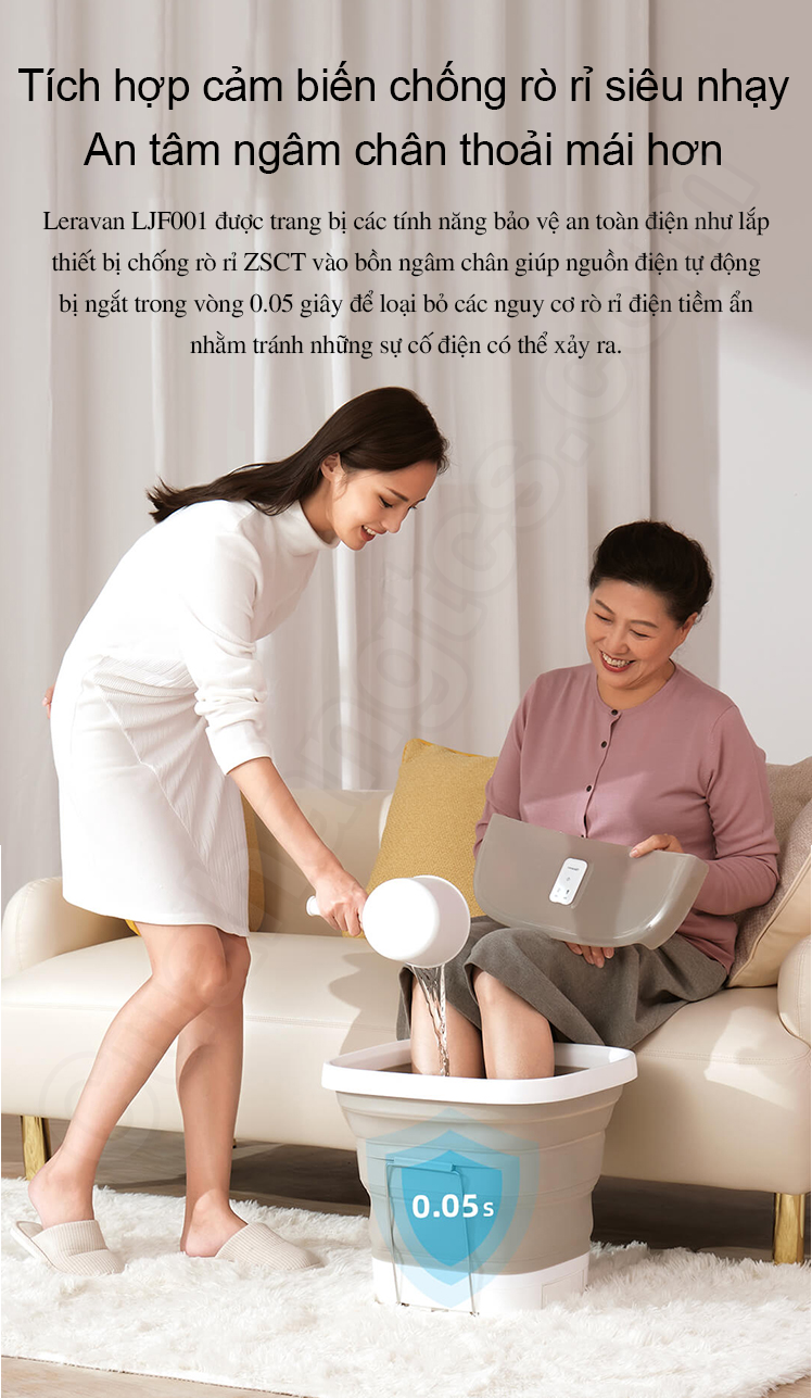 Máy massage chân bằng nước Xiaomi Leravan LJF001 được trang bị các tính năng bảo vệ an toàn điện như lắp thiết bị chống rò rỉ ZSCT vào bồn ngâm chân giúp nguồn điện tự động bị ngắt trong vòng 0.05 giây để loại bỏ các nguy cơ rò rỉ điện tiềm ẩn nhằm tránh những sự cố điện có thể xảy ra. Thiết kế ống thoát nước ẩn ở cạnh bên phía dưới của bồn ngâm chân giúp người dùng thuận tiện hơn trong việc xả nước ra ngoài mà không cần phải tốn sức nhấc bồn lên đổ nước. Đặc biệt, thiết kế lưu trữ ẩn này không chỉ giúp ngăn chặn hiểu quả tình trạng rò rỉ nước vào nguồn điện mà còn mang đến tính thẩm mỹ và đẹp mắt hơn cho sản phẩm.