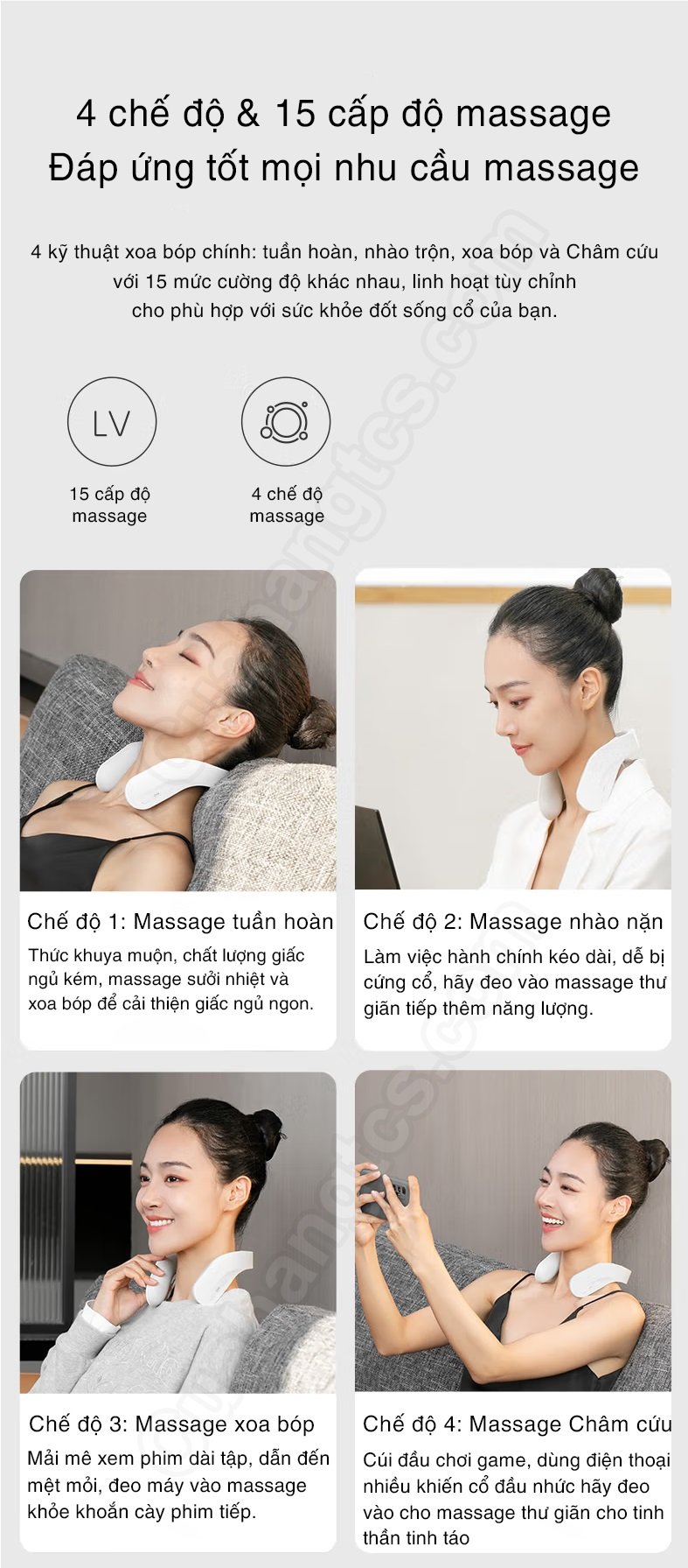 Jeeback G20 được tích hợp với 4 kỹ thuật massage chủ yếu là lưu thông, nhào trộn, xoa bóp và châm cứu kết hợp với 15 mức cường độ massage cho người dùng thoải mái lựa chọn sao cho phù hợp với nhu cầu và tình trạng cột sống cổ của mình.
