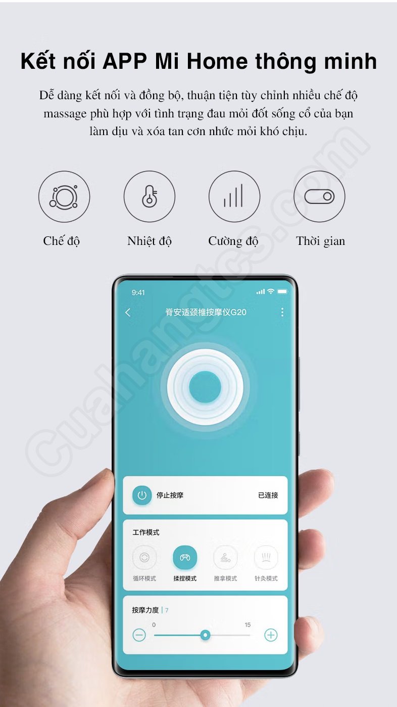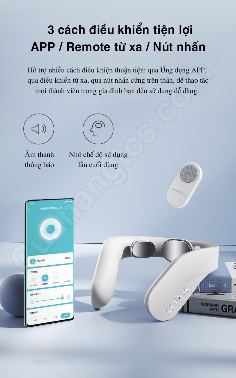 Ngoài remote được tích hợp thì người dùng còn có thể điều khiển máy mát xa cổ qua App thông minh được kết nối với điện thoại để chọn chế độ, điều chỉnh nhiệt độ, cường độ và thiết lập thời gian. Chiếc máy mát xa cũng hỗ trợ chức năng bộ nhớ cuối cùng, chế độ sử dụng lần cuối sẽ được kích hoạt khi bật nguồn để sử dụng trong lần tiếp theo, rất tiện lợi cho người cao tuổi.