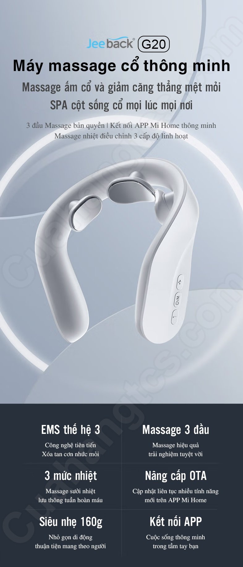 Máy massage cổ Jeeback G20 thông minh, kết nối app mihome, massage công cao EMS thế hệ 3, lưu thông tuần hoàn máu với 3 mức nhiệt, xua tan các áp lực, đau nhức ở vùng cổ mà không cần dùng thuốc.