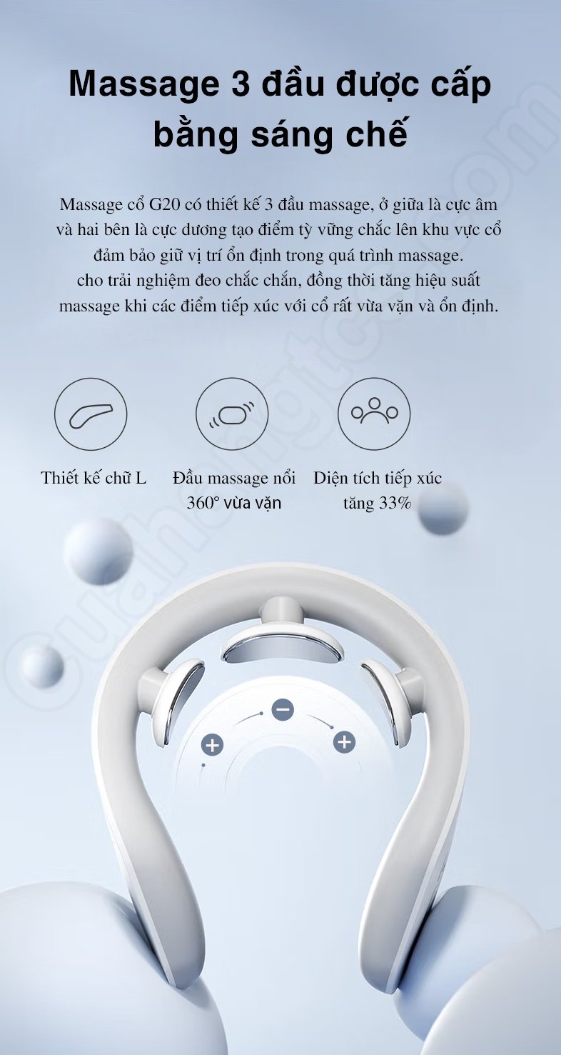 Máy mát xa Jeeback G20 sử dụng 3 đầu massage điện cực nổi 360° cho hiệu quả tác động sâu hơn, ôm khít hơn và tăng diện tích tiếp xúc nhiều hơn. Ngoài ra, các thiết bị máy masage 2 điện cực truyền thống thường dễ làm lệch các điện cực gây cảm giác châm chích cho người dùng. Và G20 sử dụng 3 đầu massagee cực âm ở giữa và cực dương hai bên tạo thành một vùng massage đa hướng, dù cho người dùng có di chuyển, lắc chiếc máy massage như thế nào nó vẫn đảm bảo rằng ít nhất một bên của cực âm và cực dương được kết nối, thao tác massage luôn được duy trì và không gây giật hay châm chích.