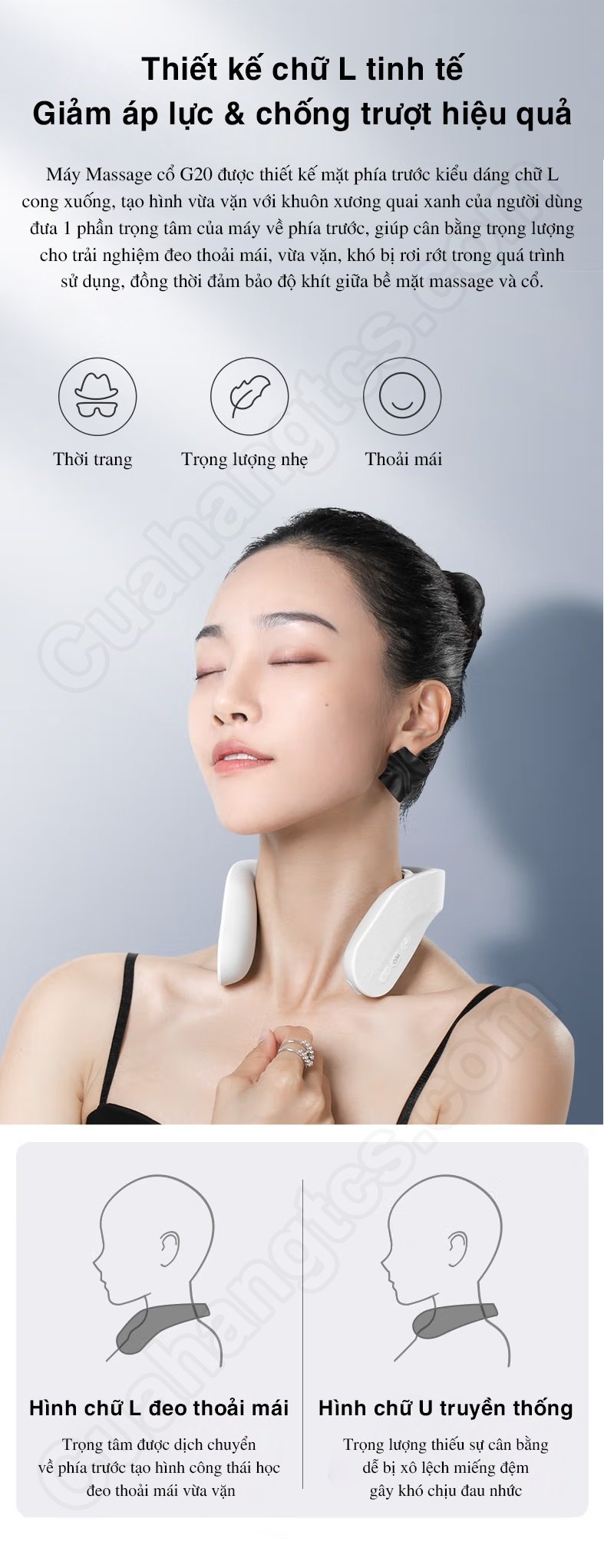 Khác với thiết kế chữ U truyền thống, máy matxa cổ G20 sử dụng kết nối hình chữ L đeo cổ vô cùng cân đối, đảo bảo vừa vặn và không bị trượt trong quá trình sử dụng. Cụ thể, phần đầu phía trước của máy matxa được thiết kế hình chữ L chùng xuống để tạo độ vừa vặn hơn với cổ, đồng thời các bộ phận chính của máy sẽ được tích hợp di chuyển ra phía trước để chuyển trọng tâm về phía trước. Từ đó, sẽ không gây áp lực lên vùng động mạch cổ, không làm trượt và đảm bảo được các miếng đệm cực được tiếp xúc gần hơn với vùng da.