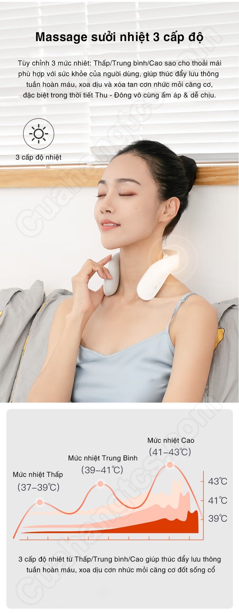 Chiếc máy massage G20 cũng được trang bị chức năng chườm nóng ở nhiệt độ không đổi. Khi sử dụng cùng lúc với chức năng massage sẽ cho tác động kép, nâng cao hiệu quả kích hoạt các cơ ở vùng cổ, rất thích hợp để sử dụng vào mùa thu và mùa đông. Hơn nữa, chức năng massage nhiệt còn có thể được sử dụng riêng độc lập tùy nhu cầu của người dùng để kích hoạt lưu thông máu, làm ấm và dễ chịu hơn ở vùng cổ.