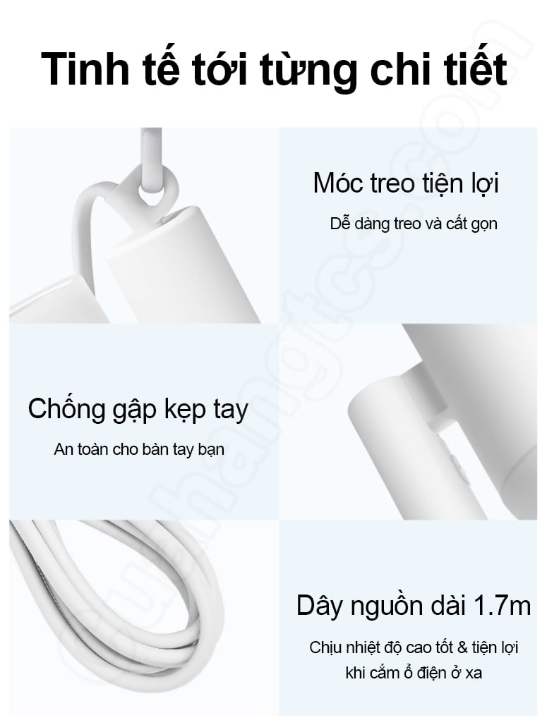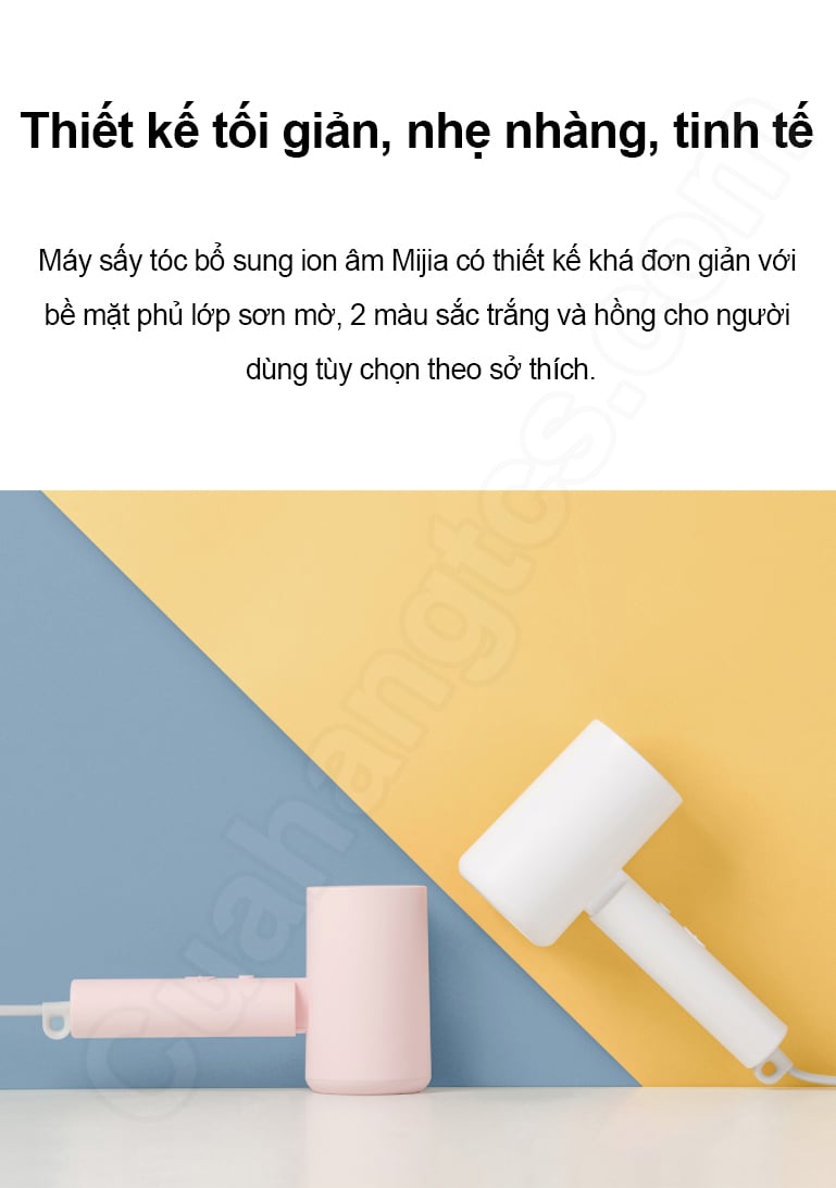 Các loại máy sấy tóc thông thường nhanh chóng làm khô tóc nhưng cũng khiến tóc trở nên xơ và hư tổn. Với việc bổ sung ion âm, Máy sấy tóc Mijia H101 vừa giúp tóc bạn nhanh khô đồng thời chăm sóc tóc bạn tốt hơn, khiến tóc bạn luôn mượt mà sau mỗi lần sấy.