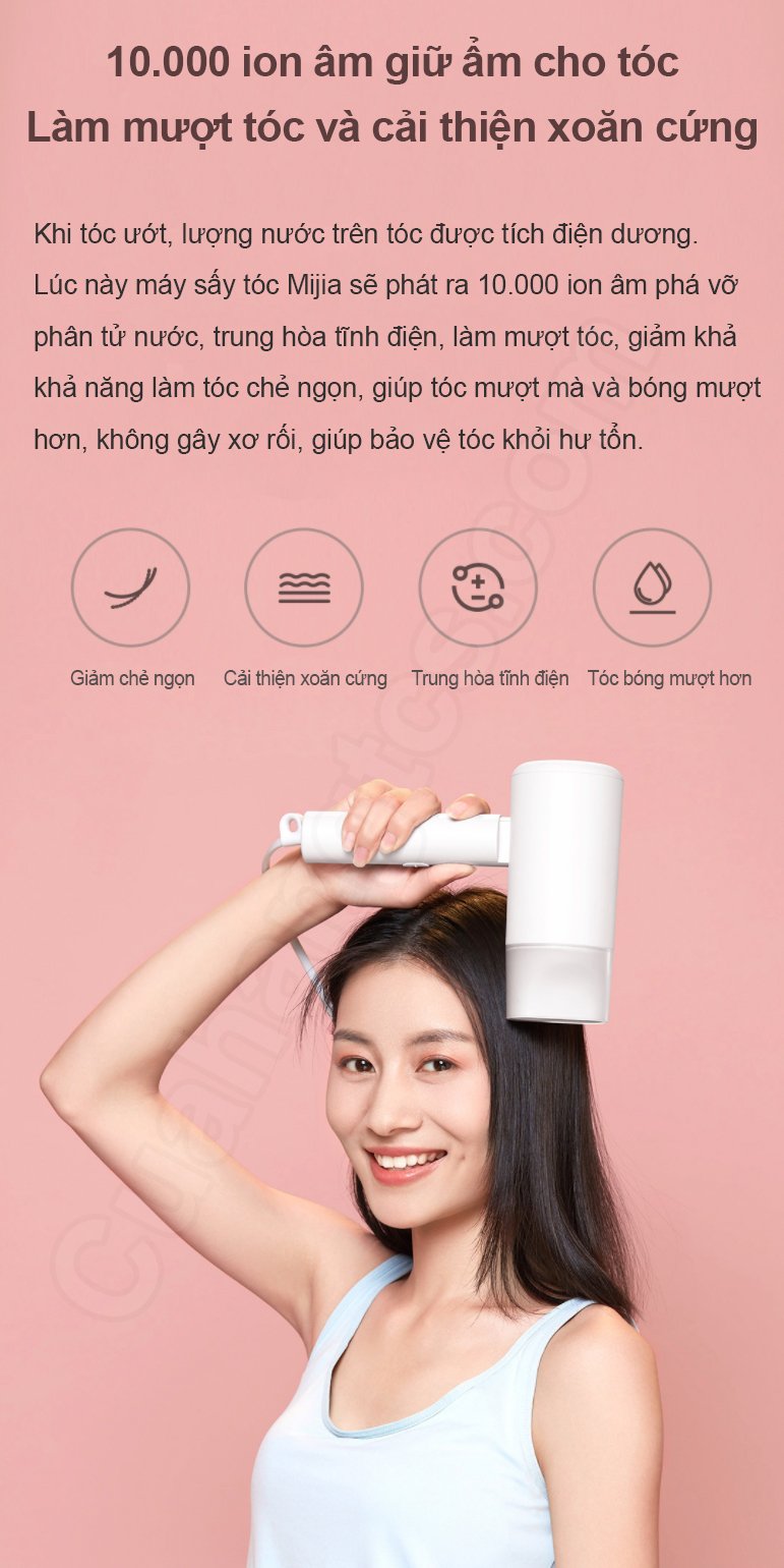 Khi tóc ướt, lượng nước trên tóc được tích điện dương. Lúc này máy sấy tóc Mijia H101 sẽ phát ra 10.000 ion âm phá vỡ phân tử nước, làm quá trình bốc hơi diễn ra nhanh hơn, từ đó rút ngắn thời gian sấy tóc. Ngoài ra máy sấy tóc ion còn giữ được độ ẩm ở phần bên trong tóc, không gây xơ rối, giúp bảo vệ tóc khỏi hư tổn.