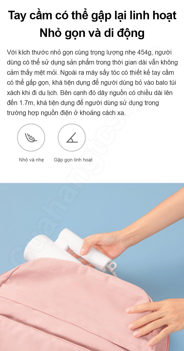 Máy sấy tóc bổ sung ion âm Mijia H101 có thiết kế khá đơn giản với bề mặt phủ lớp sơn mờ. 2 màu sắc trắng và hồng cho người dùng tùy chọn theo sở thích. Với kích thước nhỏ gọn cùng trọng lượng nhẹ 454g, người dùng có thể sử dụng sản phẩm trong thời gian dài vẫn không cảm thấy mệt mỏi. Ngoài ra máy sấy tóc có thiết kế tay cầm có thể gấp gọn, khá tiện dụng để người dùng bỏ vào balo túi xách khi đi du lịch. Bên cạnh đó dây nguồn có chiều dài lên đến 1.7m, khá tiện dụng để người dùng sử dụng trong trường hợp nguồn điện ở khoảng cách xa.