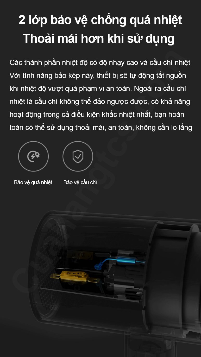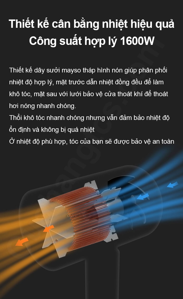 Bên cạnh đó máy sấy tóc bổ sung ion có thiết kế hình nón, giúp phân phói nhiệt độ hợp lý, mặt trước dẫn nhiệt đồng đều để làm khô tóc, mặt sau với lưới bảo vệ cửa thoát khí để thoát hơi nóng nhanh chóng. Bên cạnh đó thiết kế giảm tiếng ồn cho quá trình trải nghiệm sản phẩm thoải mái hơn, thiết kế 2 lớp cách nhiệt giảm nhiệt độ đầu sấy, đồng thời giúp người dùng tránh nguy cơ bị bỏng. Nhà sản xuất còn trang bị 2 lớp bảo vệ gồm bảo vệ quá nhiệt và bảo vệ cầu chì. Khi nhiệt độ vượt quá phạm vi an toàn thì máy sấy sẽ tự động tắt nguồn để đảm bảo an toàn.