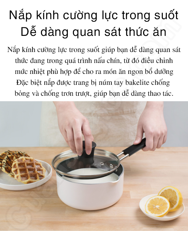 Nồi nấu cháo nấu bột Zhiwuzhu còn bao gồm nắp đậy được gia công từ chất liệu kính cường lực dày với khả năng chống chịu nhiệt tốt. Thiết kế nắp trong suốt cho phép người dùng dễ dàng quan sát thực phẩm trong nồi,từ đó có thể điều chỉnh mức lửa phù hợp để làm chín thực phẩm nhằm giữ được hương vị tốt nhất. Thiết kế nắp với tay cầm phía trên khá chắc, chống trơn trượt.