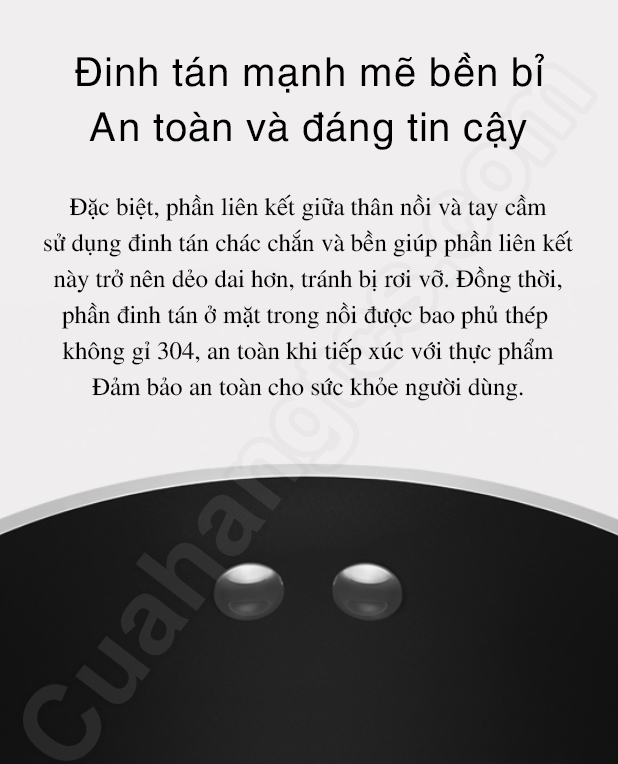 Đặc biệt việc sử dụng kết nối kiểu đinh tán dày giữa thân nồi và tay cầm nồi trở nên cứng, bền cà chắc hơn, ngăn ngừa sự cố rơi vỡ. Các đinh tán được bọc thép không gỉ 304 hoàn toàn an toàn với thực phẩm.