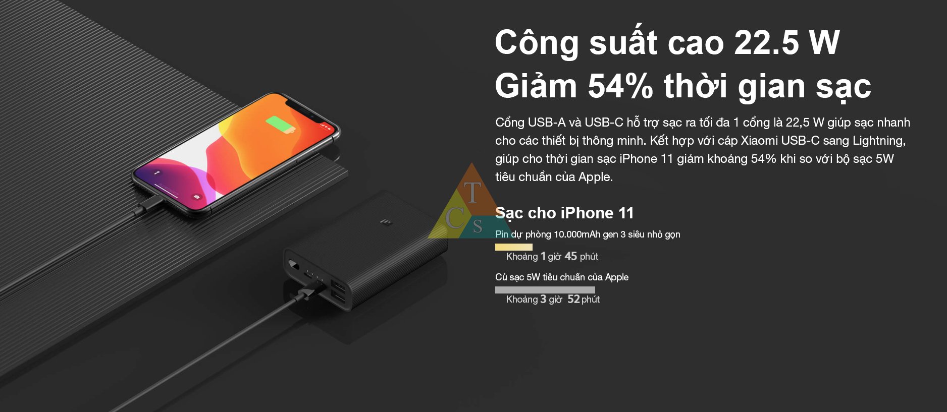 Xiaomi Mi 3 Ultra Compact BHR4412GL là dòng pin sạc dự phòng chuyên sạc nhanh cho iphone. Chỉ cần kết hợp với dây sạc usb-c to lightning, giúp cho thời gian sạc iPhone 11 giảm khoảng 54% khi so với bộ sạc 5w tiêu chuẩn của Apple.