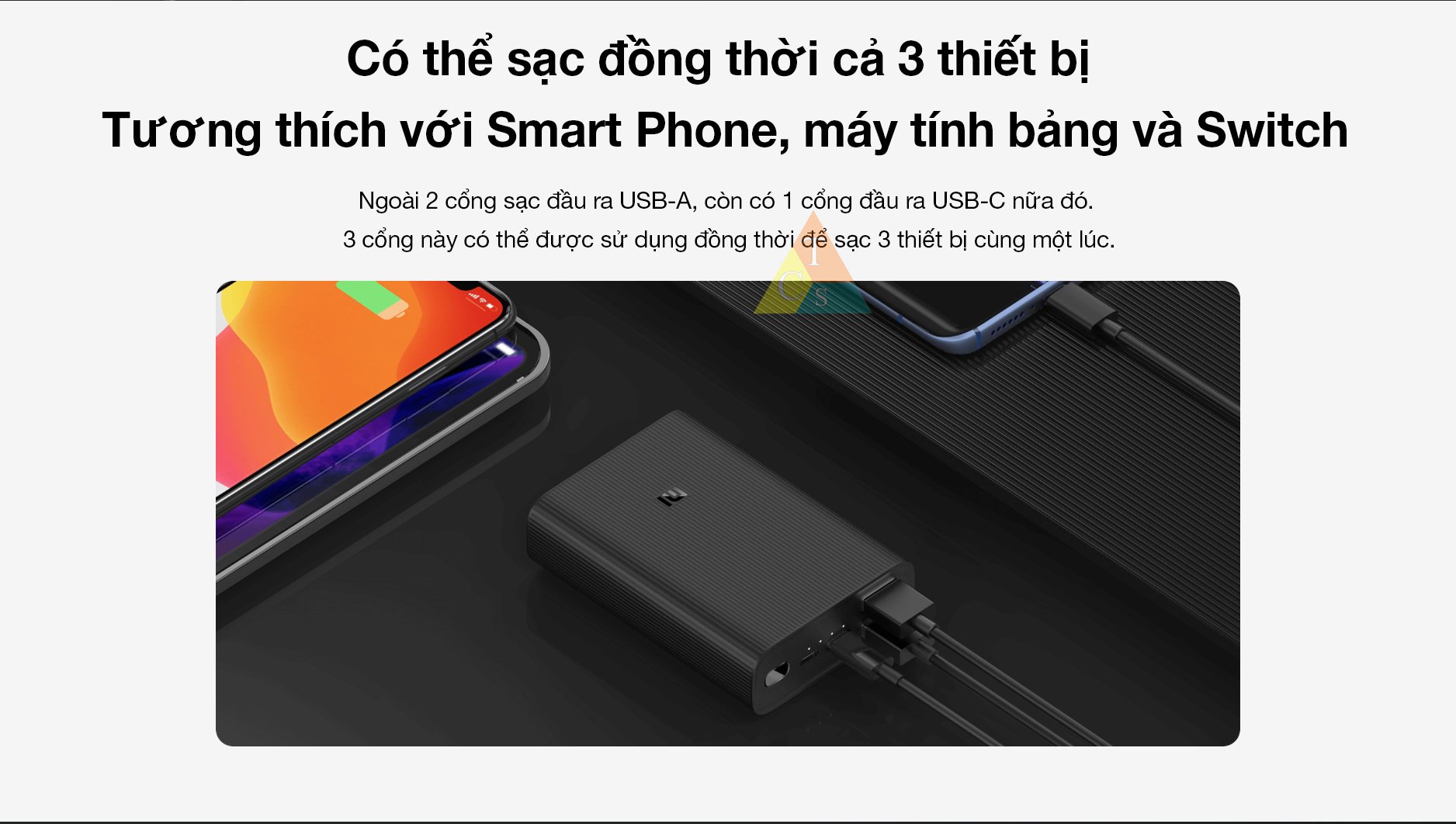 Ngoài hai cổng USB-A, Pin sạc dự phòng 10000mAh Mi 3 Ultra Compact BHR4412GL còn được tích hợp thêm một cổng USB-C tiện dụng. Ba cổng kết nối này có thể sử dụng đồng thời trong cùng một thời điểm. Cho phép bạn sạc mọi thiết bị di động quanh mình như smartphone, tablet, hay smartwatch, thực sự linh hoạt và hết sức đa năng.