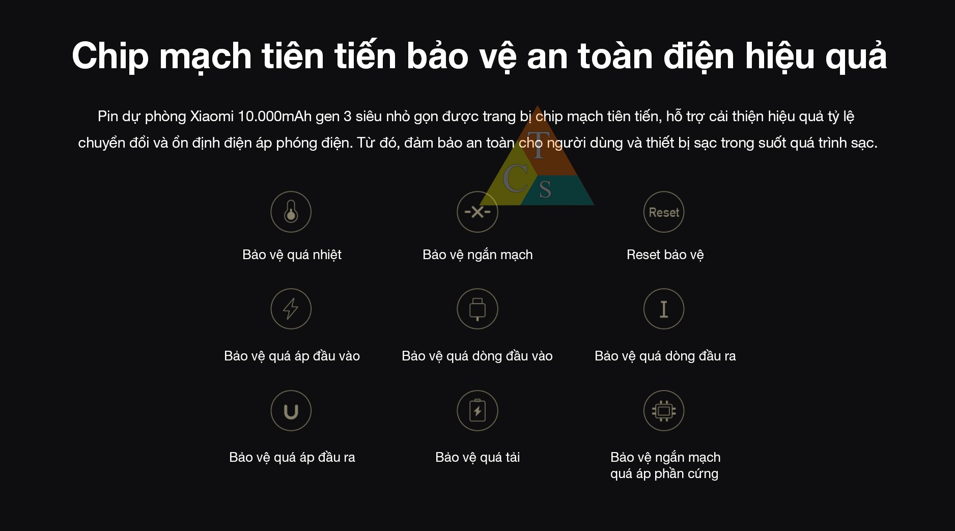 Trên Pin dự phòng Mi Ultra Compact BHR4412GL, nhà sản xuất đã ứng dụng công nghệ chip IC chất lượng cao kết hợp với cảm biến điện dung và điện cảm có độ chính xác cao nhằm đảm bảo tính an toàn trong quá trình sử dụng. Xuyên suốt vòng đời sử dụng của bộ sạc, thiết bị sẽ duy trì những phương pháp bảo vệ như: Bảo vệ nhiệt độ, bảo vệ đoản mạch, bảo vệ quá áp, bảo vệ quá dòng đầu vào, bảo vệ quá dòng đầu ra, bảo vệ quá áp đầu ra…