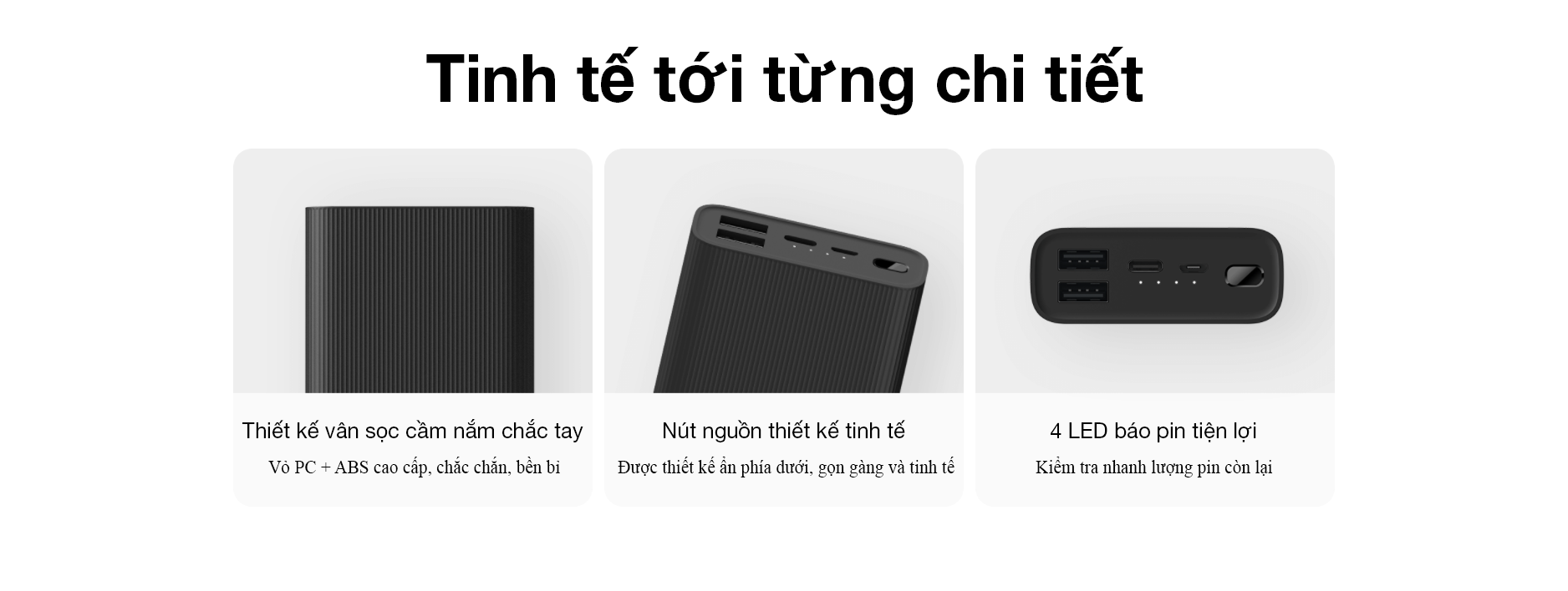 Bộ sạc dự phòng Mi 3 Ultra Compact BHR4412GL được hoàn thiện từ những chất liệu cao cấp và thân thiện với môi trường. Trong đó, bộ vỏ kết hợp từ PC và ABS cho thấy độ bền cao, được làm nhám nhẹ để tránh lưu dấu mồ hôi đồng thời tránh xước xát khi bạn cầm theo bên người. Toàn bộ cấu trúc của Mi Ultra Compact được làm theo phong cách nguyên khối bền bỉ, liền mạch.